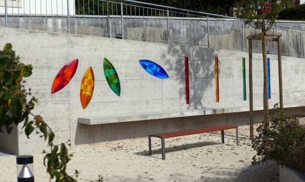 An einer Mauer finden sich künstlerisch gestaltete Schemen der Rabatten aus farbigen Glas mit der Möglichkeit die Namen der Verstorbenen anzuschreiben.