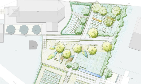 Lockere freiwachsende Bäume, ein neues Wasserbecken und helle Bodenbeläge lassen die Anlage hell und freundlich wirken.