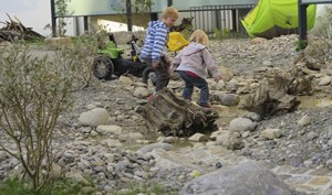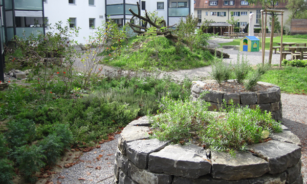 Spielbereiche, Treffpunkte, Rückzugs- nischen, Nutz- und Kräutergärten, Obstbäume, Beerensträucher und ein Gemeinschaftsplatz mit Grillstelle ermöglichen unterschiedliche Beschäftigungen. Wildhecken, Blumenwiese, Trockenmauern, Kies- und Ruderalflächen, Trocken- und Feuchtstandorte, Hochstauden- flächen und Krautsäume bieten verschiedenste Lebensräume für eine Vielzahl an Tieren und Pflanzen.