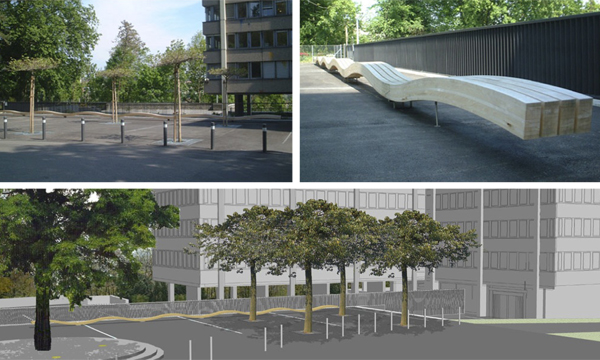 Die Wechselbeziehung Stadt-Aareraum ist Thema für ein beidseitig bedienbaren Sitzelement, das mit seiner Wellenform an die im Sommerhalbjahr nicht sichtbare Aare erinnert.
