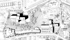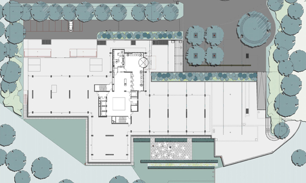 Das Umgebungsgestaltungskonzept reagiert auf die verschiedenen räumlichen und städtebaulichen Situationen. Die Anbindung an den innerstädtischen Raum an der Taubenstrasse erfolgt mit einem modern und schlicht gestalteten Vorplatz. Auf der anderen Gebäudeseite wird der Übergang in den Aareraum mit einem orthogonalem Sitzplatz, über geschnittene Hecken bis zu heimischen Waldsaumstauden zum Thema der Umgebungsgestaltung. Daneben wird die ursprüngliche Idee, der Blick in den Aareraum unter dem Gebäude hindurch, erhalten und durch keine räumlich wirksamen Elemente gestört.