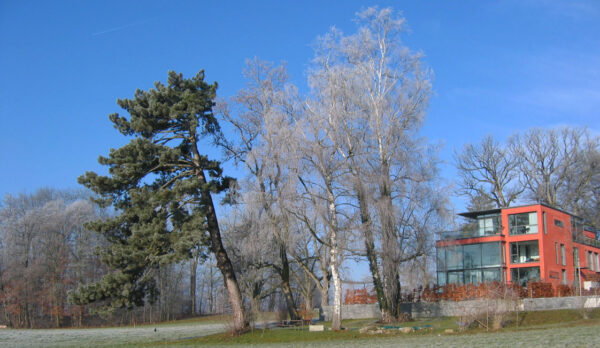 Durch den Erhalt einer alten Baumgruppe wirkt die Überbauung von Anfang an als Bestandteil der Umgebung.