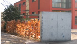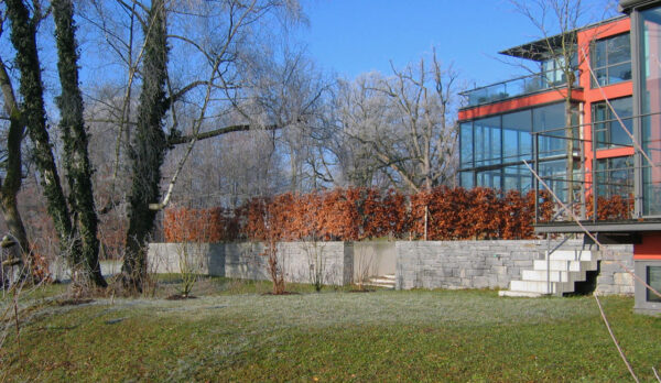 Hainbuchenhecken bilden im jahreszeitlichen Wechsel ein spannendes Gegenüber zu den Fassaden. Das frische Grün im Frühjahr zeigt die Komplementärfarbe, während das Rostrot im Winter fast mit der Fassadenfarbe verschmilzt.